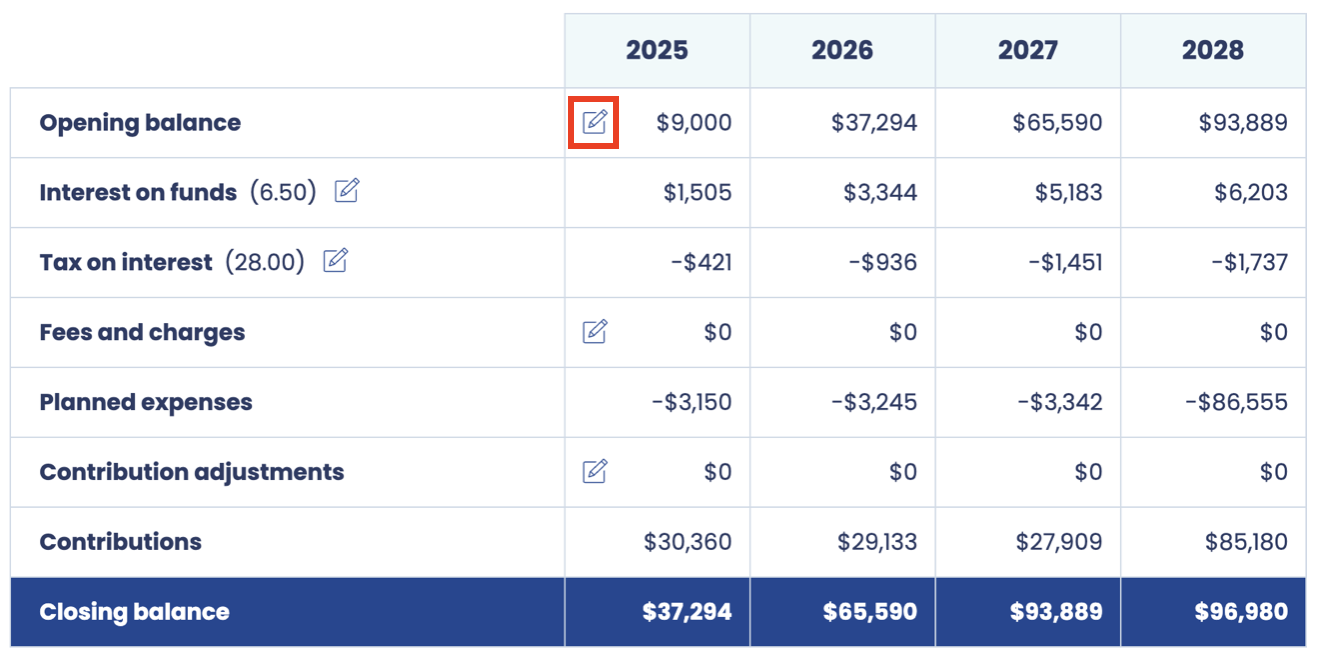 Click the edit button in the Opening Balance cell for the year you want to adjust.