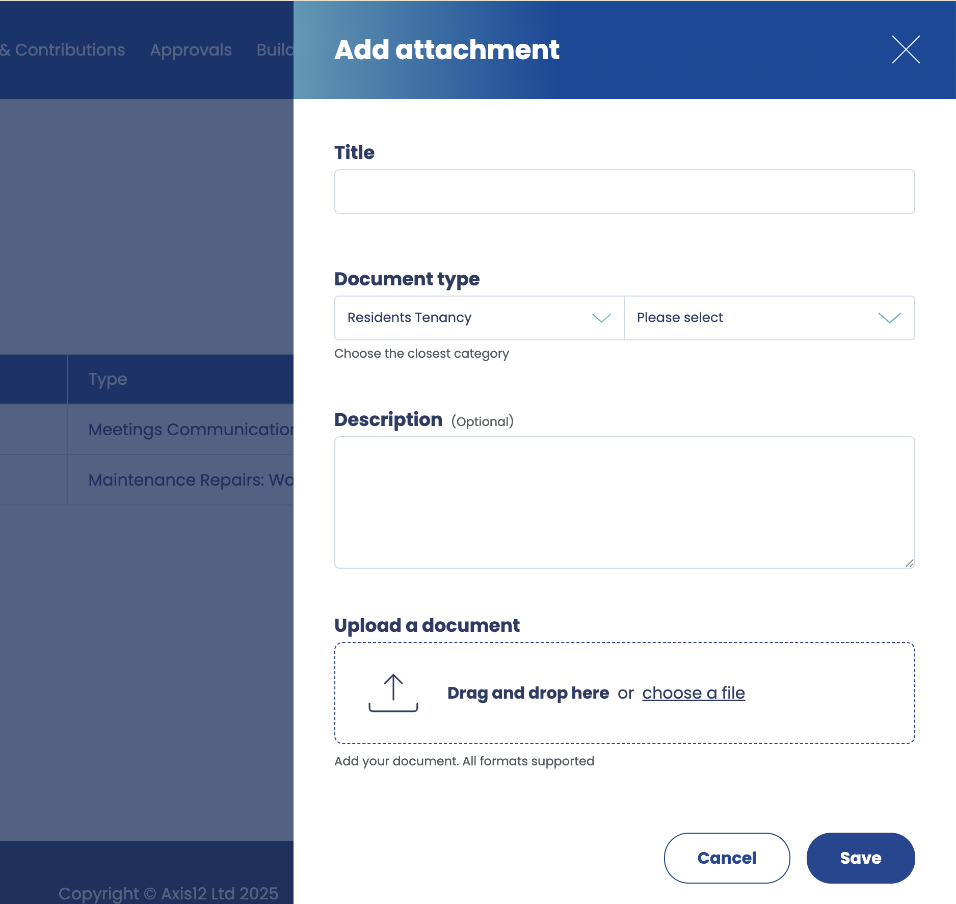 The Add a Document side panel allows you to add new documents to your building’s document library.